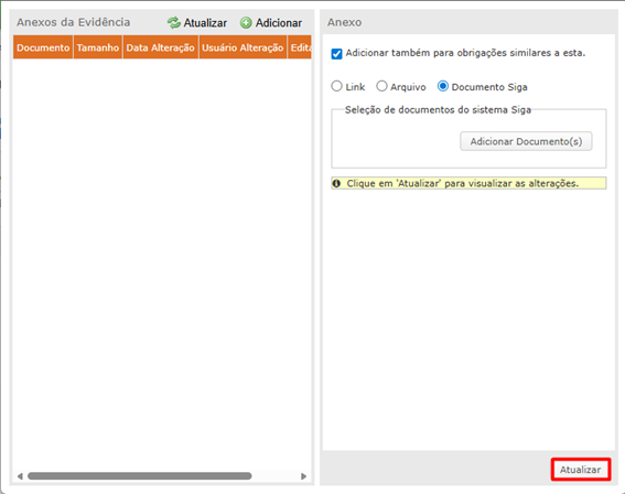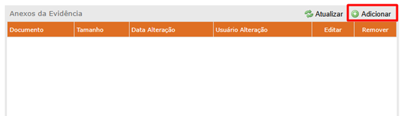 Ao clicar, o sistema irá abrir a janela de anexos da evidência. Clique em “Adicionar” para anexar arquivos