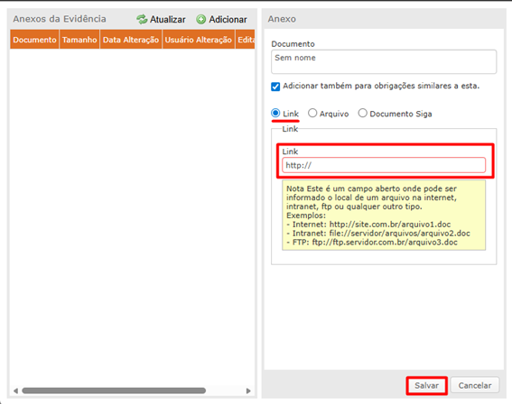 Se for um link, selecione a opção “Link”, preencha a caixa de texto e clique em “Salvar”