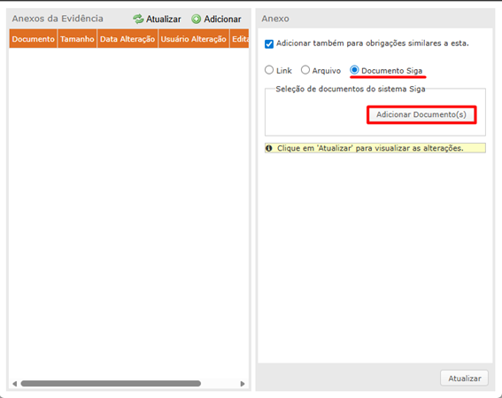 Se for um documento do módulo Siga, selecione a opção “Documento Siga” e clique em “Adicionar Documento(s)”
