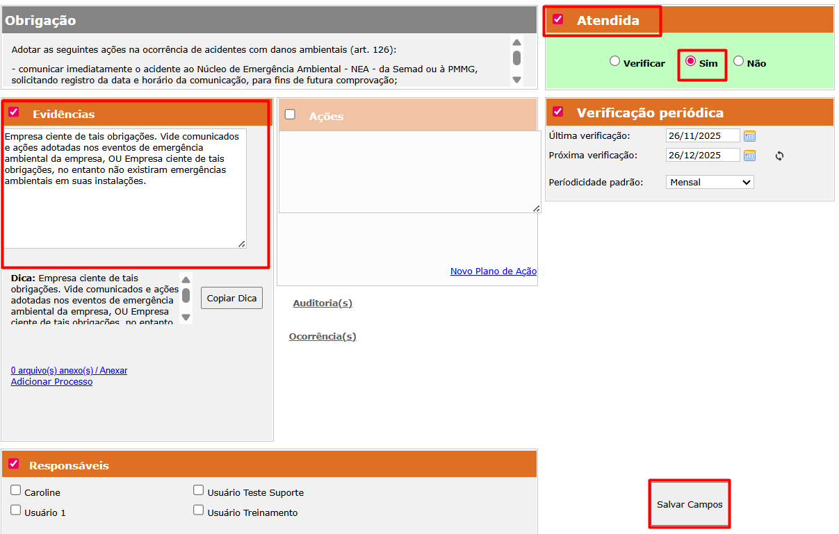 Também é possível incluir um prazo para verificação periódica ou registrar um plano de ação, se necessário.