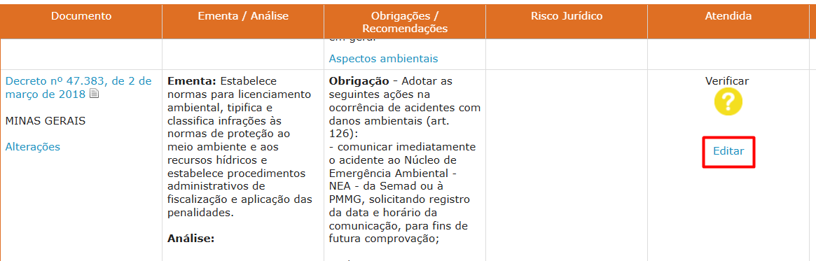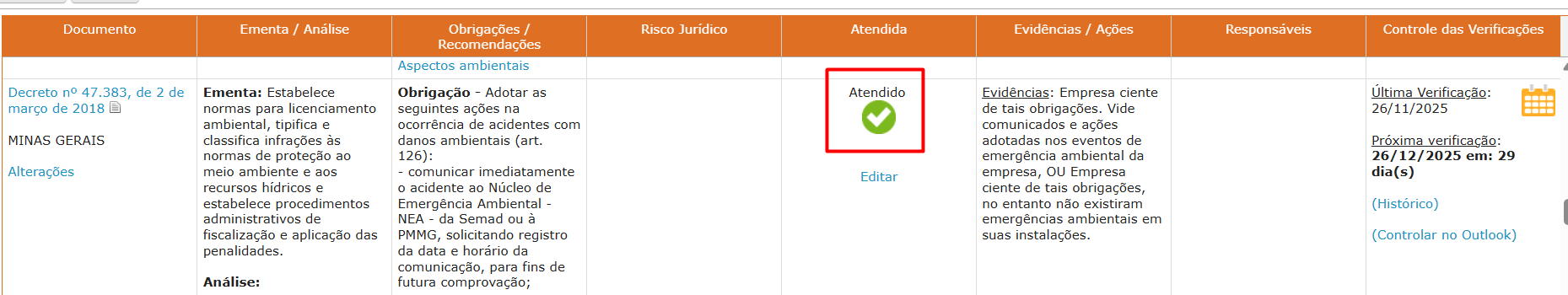 O sistema Legal utiliza, por padrão, três status para classificar uma obrigação: “Verificar”, “Atendido” e “Não atendido”. Para atualizar uma obrigação para o status “Atendido”, siga as orientações desta FAQ.