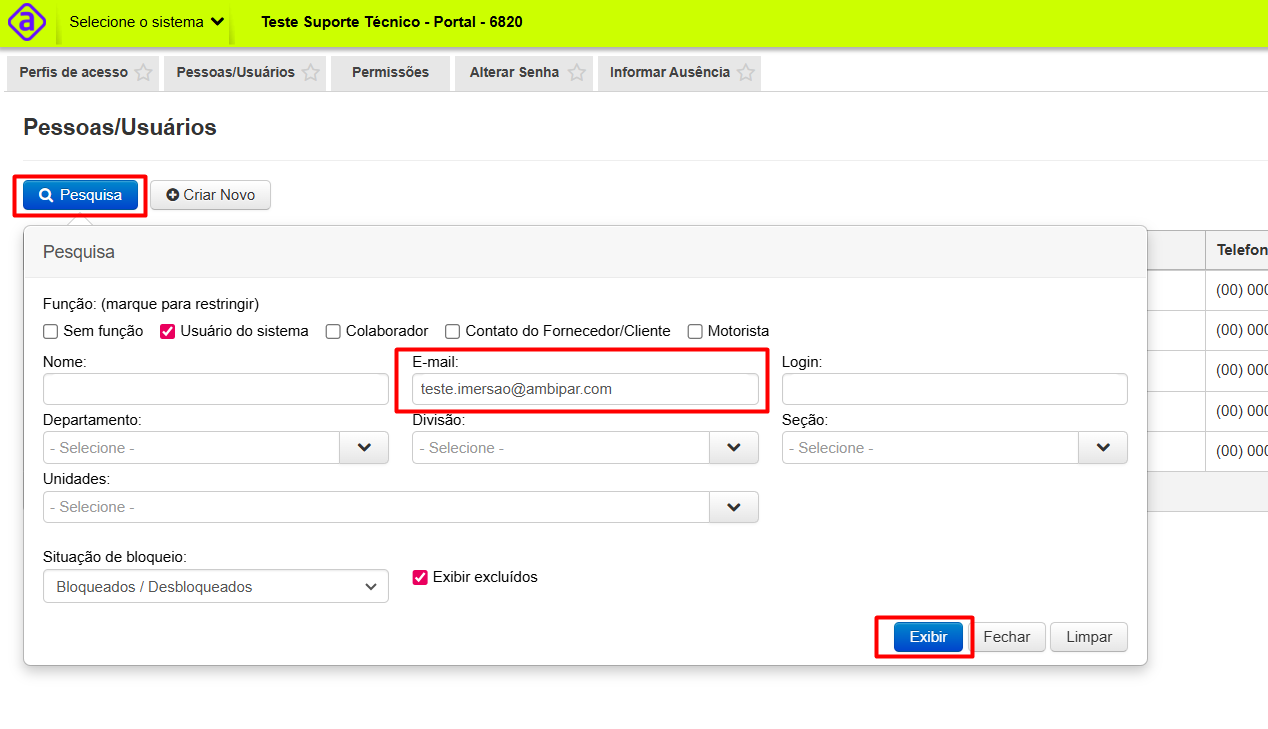 Para localizar o usuário que terá o acesso corporativo utilize os filtros através da aba  “Pesquisar”. A forma mais assertiva é através da busca pelo e-mail do usuário. Clique em “Exibir” para aplicar o filtro.