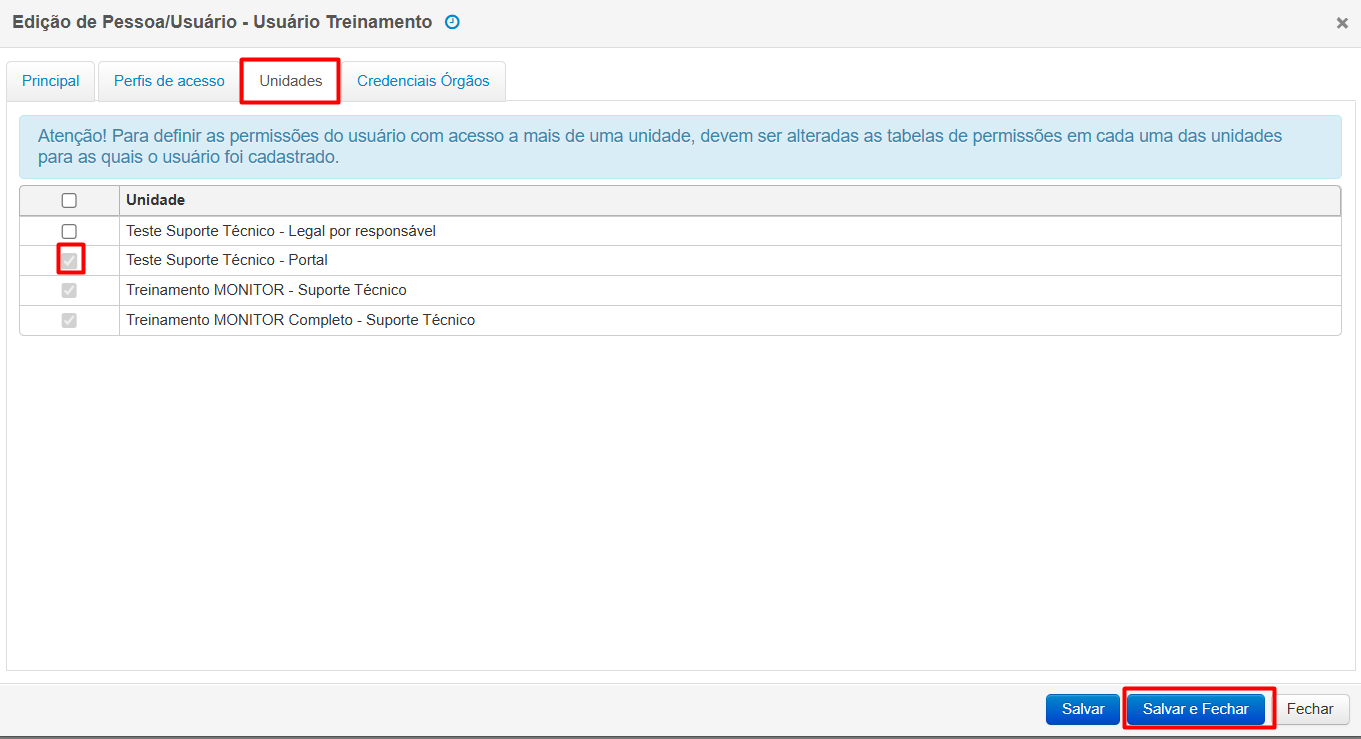 NOTA: Para definir as permissões do usuário com acesso a mais de uma unidade, devem ser alteradas as tabelas de permissões em cada uma das unidades para as quais o usuário foi cadastrado, conforme tutorial nos links “Permissões Legal” e “Perfis de Acesso”