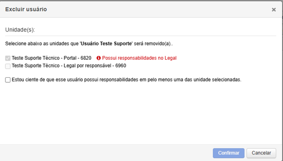 Caso o usuário tenha responsabilidade no sistema Legal na unidade, o sistema irá informar e só concluirá a exclusão após você confirmar esse processo.