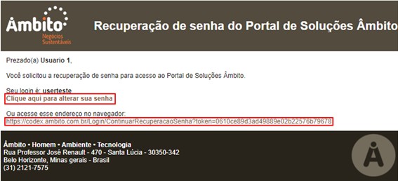 O e-mail encaminhado informa qual o login do usuário e possui o link para realizar o cadastro da nova senha